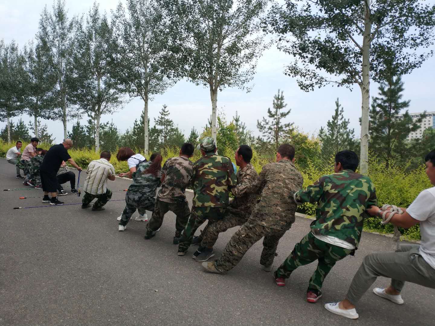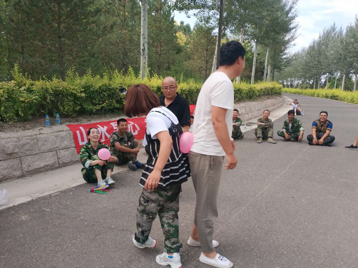 早上8點(diǎn)到黃河樓后,我們對(duì)18名新學(xué)員進(jìn)行了分組,將隊(duì)員分成兩支隊(duì)伍,由隊(duì)長(zhǎng)組織進(jìn)行游戲。在隊(duì)長(zhǎng)的帶領(lǐng)下,各隊(duì)隊(duì)員精誠(chéng)合作,相互支持,先后進(jìn)行了“跳繩比賽”、“個(gè)人跳繩比賽”、“斗牛比賽”“背對(duì)背運(yùn)氣球比賽”“拔河比賽”、“俯臥撐比賽”等拓展項(xiàng)目。