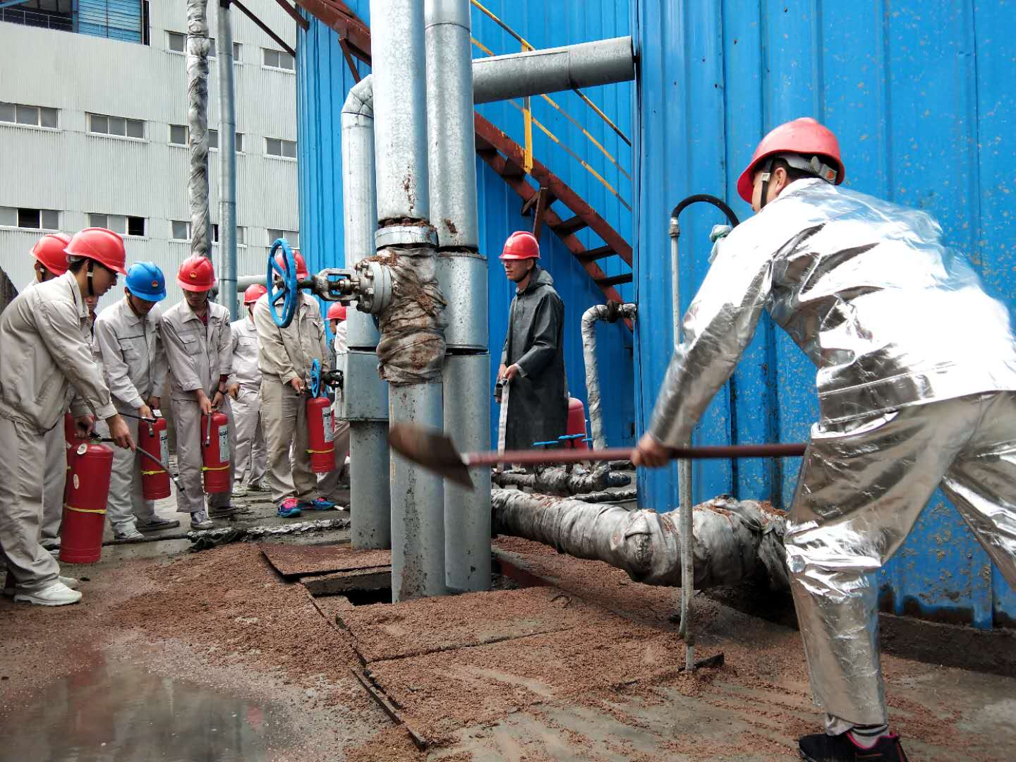 為提高公司各級人員事故防范和應急保障能力,及時有效且迅速地處理火災事故,避免或降低燃油庫區(qū)火災事故可能造成的重大經(jīng)濟損失和影響,根據(jù)公司“安全生產(chǎn)月”活動計劃,緊密圍繞“防風險、除隱患、遏事故”活動主題,2019年6月27日下午15時,寧夏興昊永勝鹽業(yè)科技有限公司組織開展了燃油庫區(qū)回油管路著火事故應急演練。