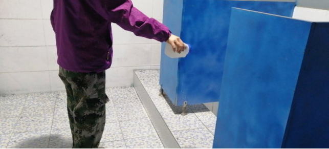 對(duì)廠區(qū)衛(wèi)生間消毒。