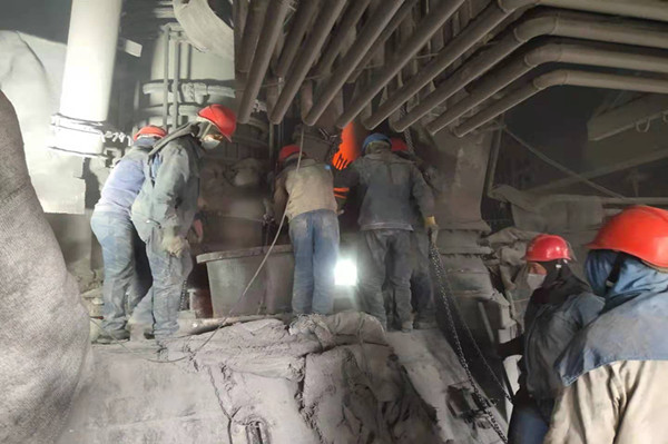 剛踏上平臺(tái),首先映入筆者眼簾的,是一群穿著藍(lán)色牛仔工裝的工友們正在有序的拆卸二層爐面保溫材料準(zhǔn)備更換燒損下料柱。只見(jiàn)他們個(gè)個(gè)干勁十足、衣服早已被汗水浸濕、黑乎乎的臉看不清誰(shuí)是誰(shuí)?他們顧不得爐面余溫的熾熱、爐面積灰的刺鼻積極投入到檢修中,一時(shí)間吶喊聲、叉車(chē)?guó)Q笛聲,起重吊車(chē)的口哨聲,聲聲作響,猶如一首交響樂(lè)響徹整個(gè)檢修現(xiàn)場(chǎng)!在大家的齊心協(xié)力下,燒損下料柱順利被拆下,并按時(shí)裝好!