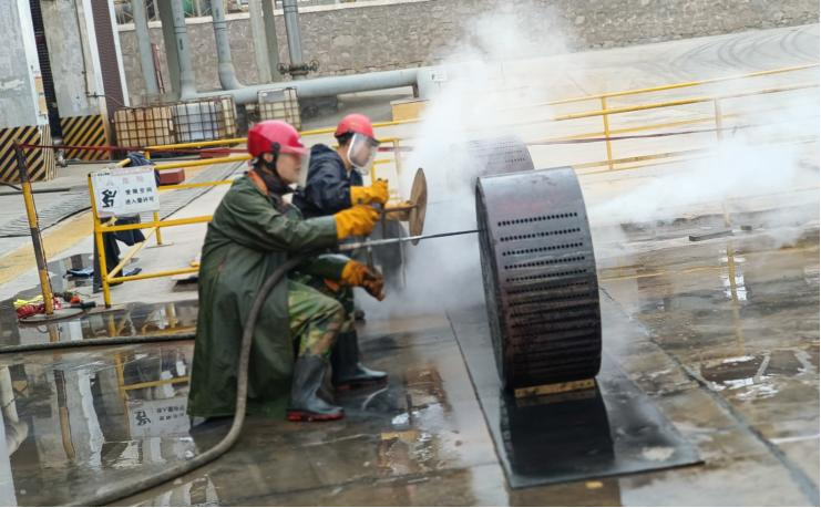 檢修已經(jīng)是第三天,接近尾聲,大家似乎已經(jīng)疲憊,但是行動上未松懈。今日的氯化氫小廣場上格外熱鬧,7:20,班長已經(jīng)開始準備今日的檢修票證,為檢修項目做準備。他的身影在朝陽地映射下顯得那么著急,沒有一點怠慢的意思,今天我們班組檢修的項目是提濃塔再沸器石墨塊疏通工作,這項工作看起來簡單,實際上是耐心地考驗。一個個細小的石墨孔需要用蒸汽一個一個疏通,檢修開始之前還是和往常一樣,安全教育是少不了的,班長一遍遍強調防護用品規(guī)范佩戴以及疏通過程中的安全注意事項,在準備工作結束后,今天的檢修工作開始了。