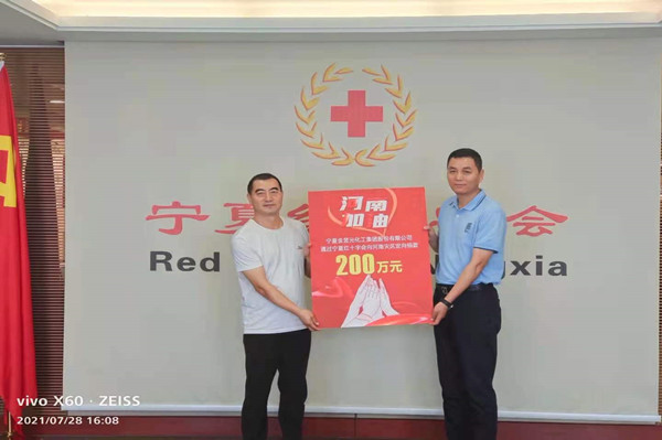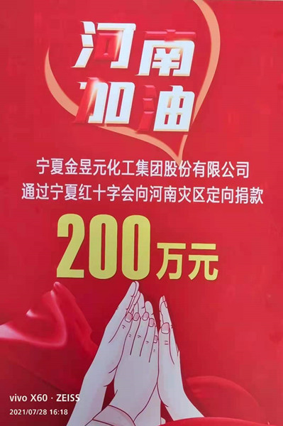 洪災(zāi)無情,人間有愛。7月28日,寧夏金昱元化工集團(tuán)股份有限公司委托寧夏紅十字會(huì)向河南災(zāi)區(qū)捐助二百萬元,馳援河南受災(zāi)地區(qū),表達(dá)對(duì)災(zāi)區(qū)人民的深切問候。