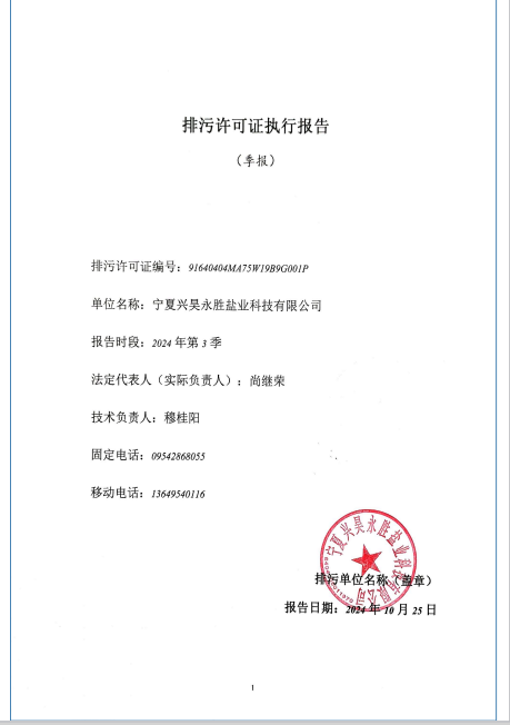 寧夏興昊永勝鹽業(yè)科技有限公司2024年第3季度排污許可執(zhí)行報(bào)告